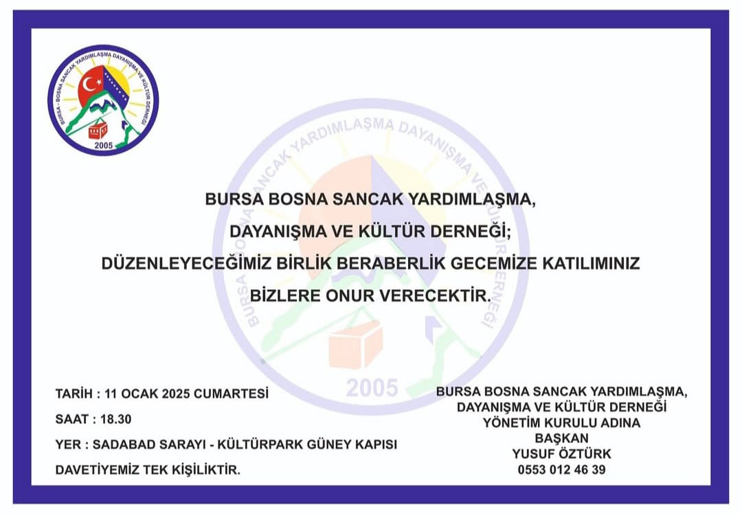 Bursa Bosna Sancak Yradımlaşma Dayanışma ve Kültür Derneği Birlik ve beraberlik gecemize davetlisiniz.