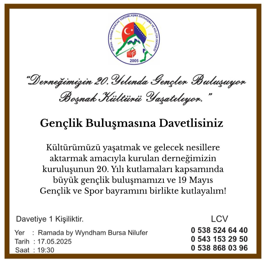 Kültürümüzü yaşatmak ve gelecek nesillere aktarmak amacıyla 2005 yılında kurulan Bursa Bosna Sancak Derneği, 20. yılına ulaşmanın gururunu yaşıyor. Bu özel yıldönümünü, kültürel mirasımızı onurlandırarak kutlamak ve gençlerimize daha güçlü bir bağ sağlamak amacıyla büyük bir gençlik buluşması düzenliyoruz.